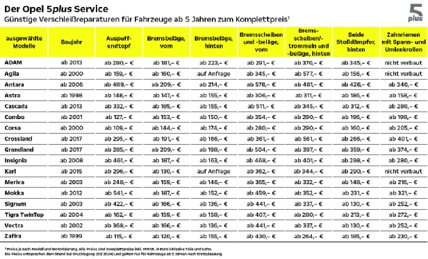 2 Die Opel 5plus Tiefpreisgarantie gilt nur bei Montage durch einen teilnehmenden Opel Partner am Fahrzeug und nur bei Verwendung von Opel Original Teilen by Mopar® oder EUROREPAR-Teilen. Voraussetzung ist die Vorlage eines schriftlichen Wettbewerbsangebots: gesondert ausgewiesene Kalkulation von Opel Original Teilen by Mopar® oder EUROREPAR-Teilen und Lohn, nicht älter als 14 Tage, Standort des Wettbewerbers innerhalb der BRD und innerhalb eines 30-km-Radius zu unserem Betrieb.